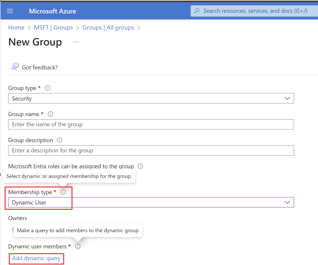 Did you know that you can also create a Dynamic group using Membership type > Dynamic User? Dynamic groups use dynamic membership rules to automatically add and remove members.