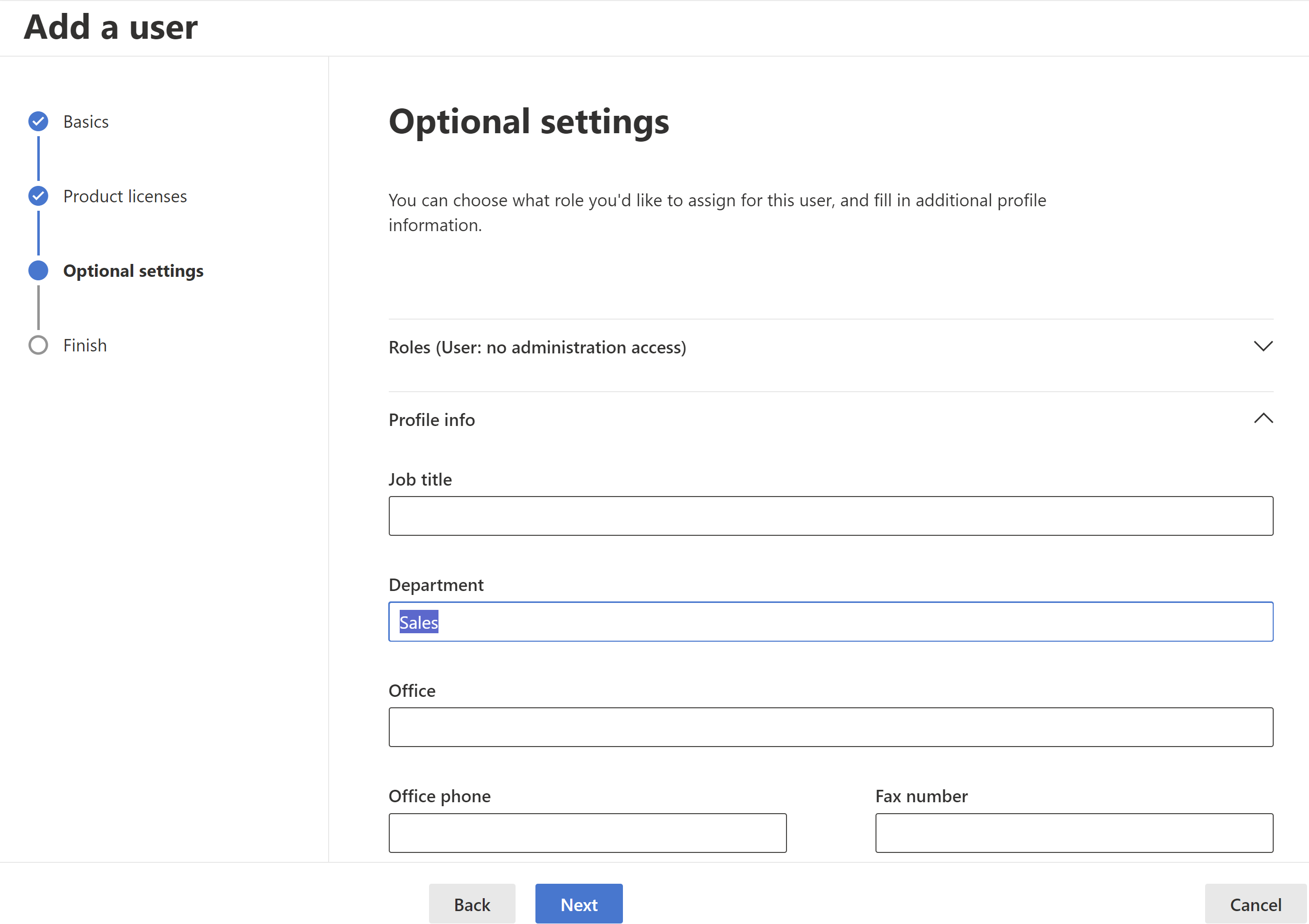 - In the Profile info > Department provide value as ‘Sales’ which matches our Dynamic group’s rule criteria.