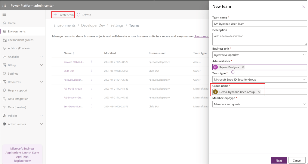 If you are wondering how the Dynamic group benefits from the Power Platform side, we can map the Dynamic group to the Dataverse team as shown below and manage the app permissions.