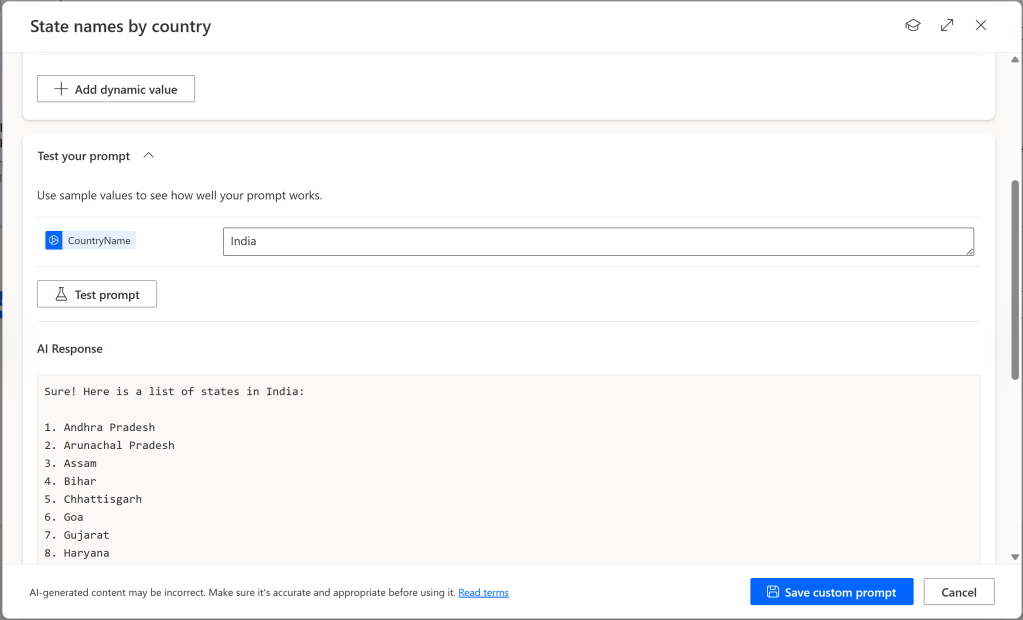 - I want the ‘Country’ to be a dynamic value, so I prepared my prompt as follows:
