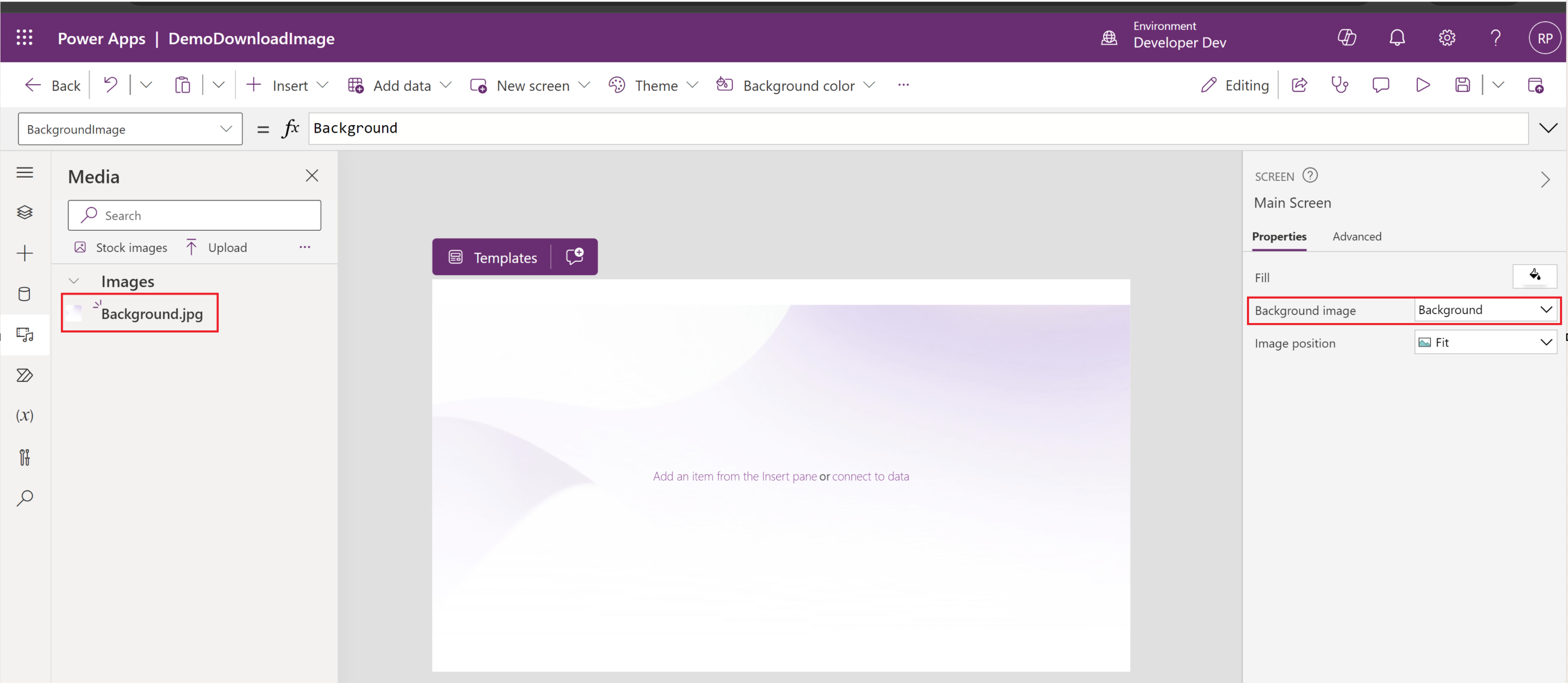 Let’s assume that you have an app that was shared by your colleague. This app includes an image named ‘Background.jpg’, which has been added to the app’s media. It is shown below: