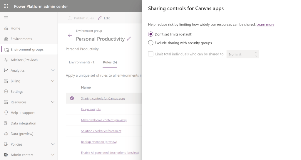 - Power Platform tenant administrators can configure the group’s rules. Currently, there are six available rules, which are the same capabilities offered when upgrading an individual environment to a Managed Environment.