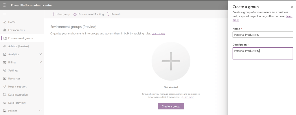 - On the Environment groups page, select Create a group.