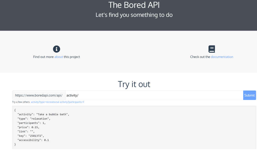 - If you need a API to quick test your application, try the https://www.boredapi.com/api/activity/
