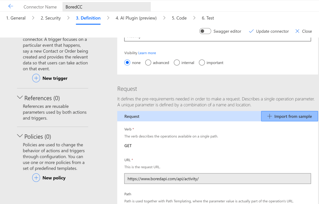 - For example, If I am learning Power Platform Custom Connectors, I can utilize the BoredAPI to quickly configure the connector, as shown below.