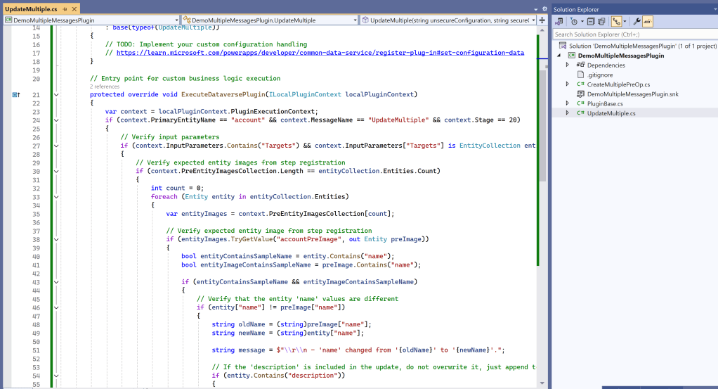- Create a new class file UpdateMultiple.cs and override the ExecuteDataversePlugin method with following code.