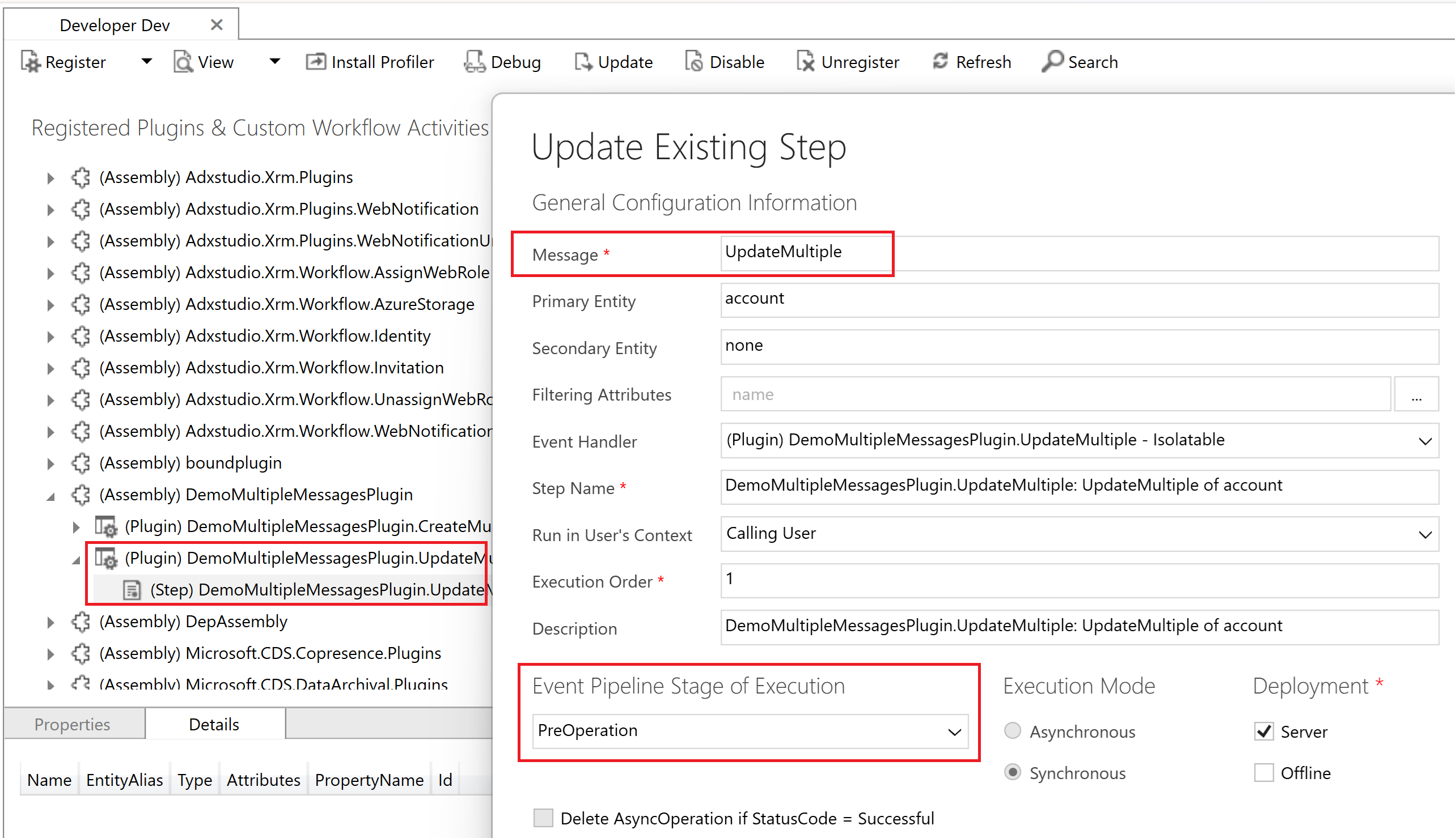 - Build the solution and update the plug-in assembly. Register a new a UpdateMultiple step as shown below.