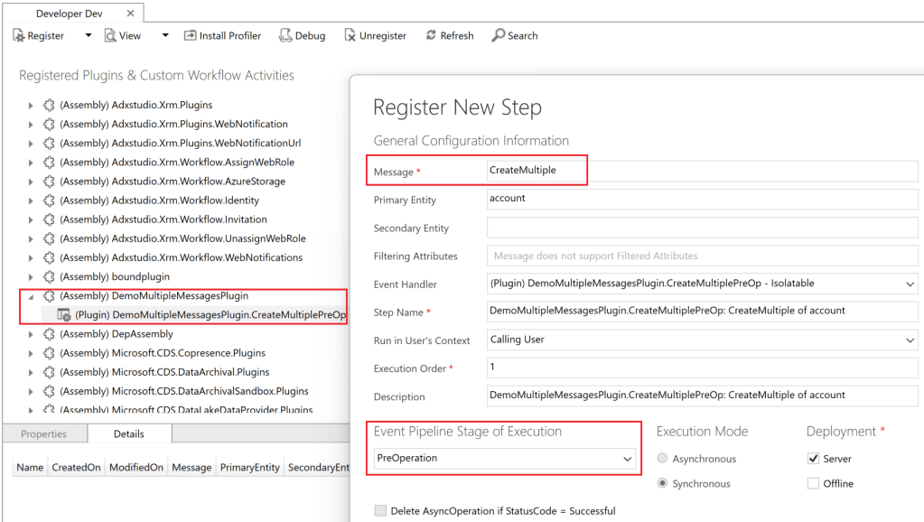 - Create a new plugin step on CreateMultiple message of account table as shown below.