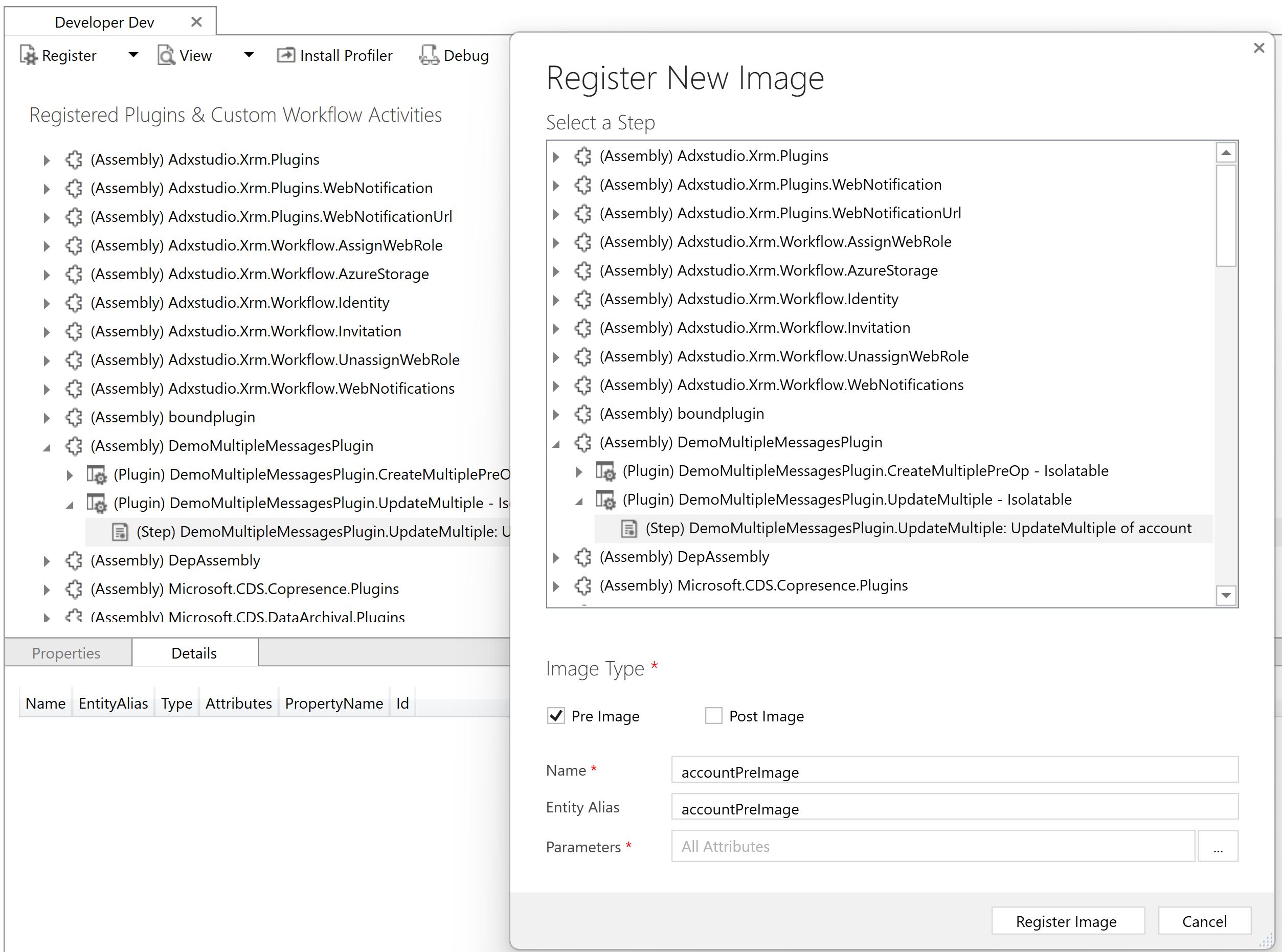 - Next, add a new pre image named accountPreImage to the UpdateMultiple plug-in step.