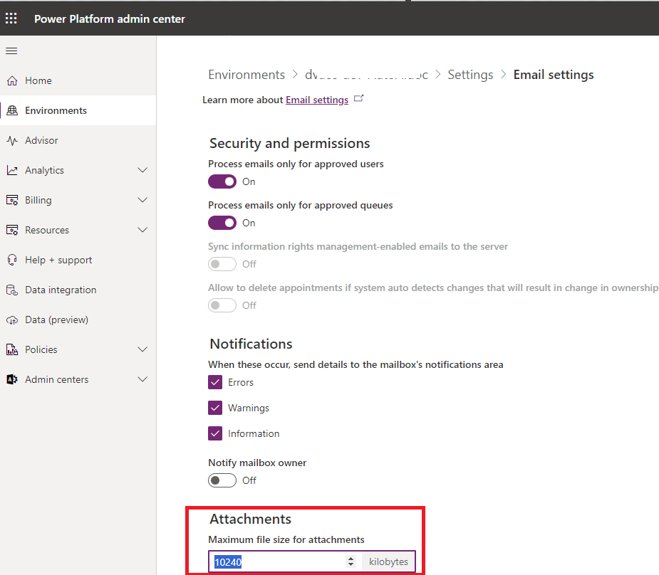 - The setting can be found in the Power Platform admin center by going to Environments > [select an environment] > Settings > Email > Email settings.