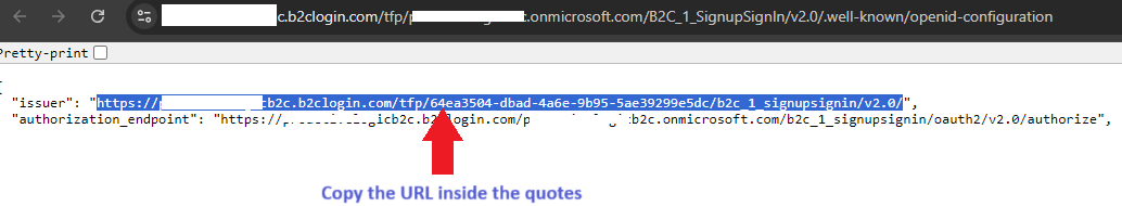 - This is my copied B2C_1_SignUpSignIn Issuer URL https://domainresdemob2c.b2clogin.com/tfp/a1xxxx-ca21-460e-ac6d-693d3xxxx/b2c_1_signupsignin/v2.0/