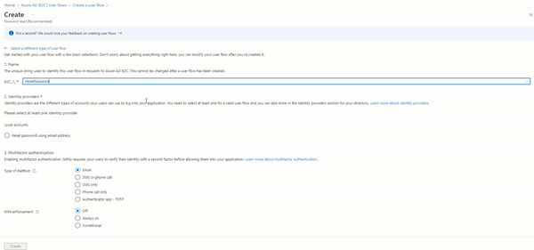 - Click on Create to complete the user flow creation.