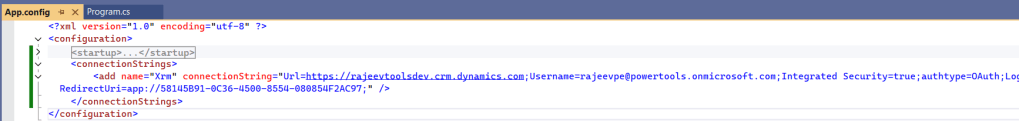 <add name="Xrm" connectionString="Url=https://rajeevtoolsdev.crm.dynamics.com;Username=rajeevpe@powertools.onmicrosoft.com;Integrated Security=true;authtype=OAuth;LoginPrompt=Auto;AppId=51f81489-12ee-4a9e-aaae-a2591f45987d;