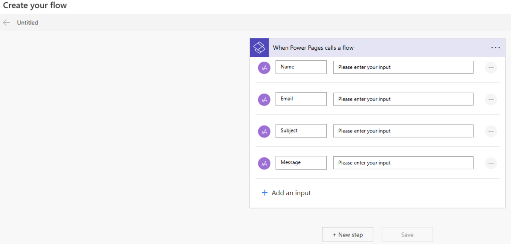 - Since we are capturing Name, Email, Subject and Message on the Contact Us form, we need to pass these inputs from the form to our Cloud Flow..