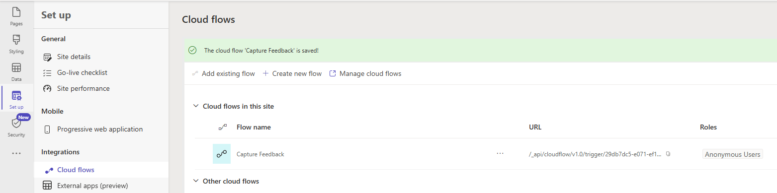 - Navigate to the Set up workspace, then select Cloud flows under Integrations.