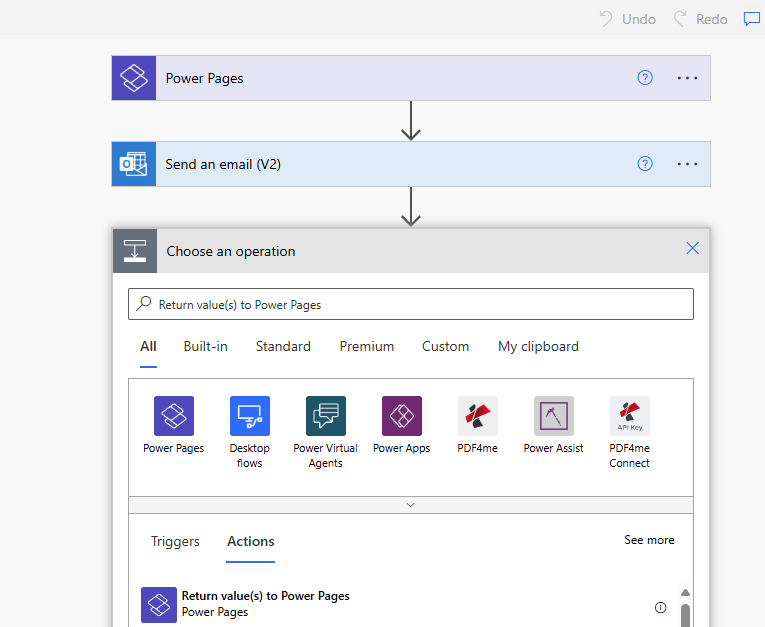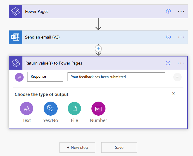 - To send the response back from the flow to the Power Pages, we need to add Return value(s) to Power Pages action.