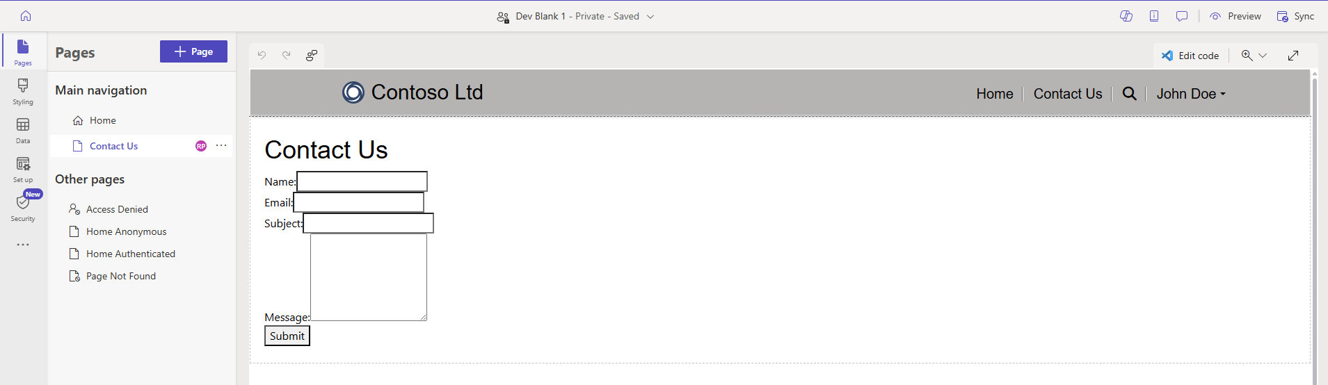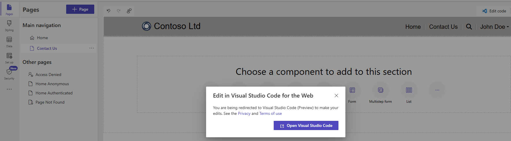 - Open the Contact Us page in code view by clicking on on Edit code > Open Visual Studio Code