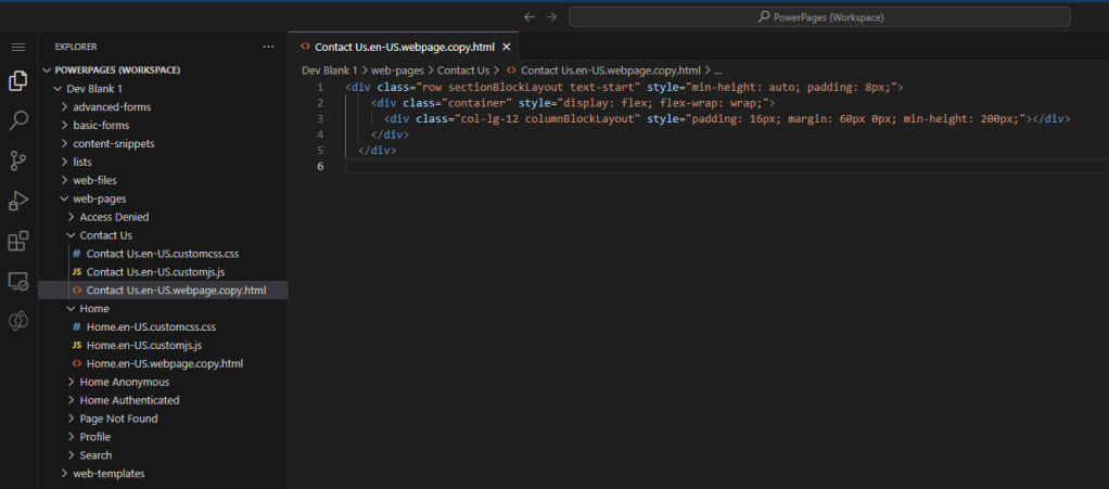 - The UI need some styling improvements. Open the Contact Us.en-US.customcss.css file in the browser’s VSCode and paste the following css.