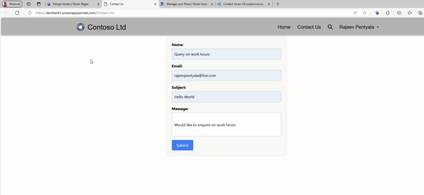 - When the user submits the details on the Contact Us page, they will be sent to a cloud flow. The cloud flow will process the details and send an email to the support team.