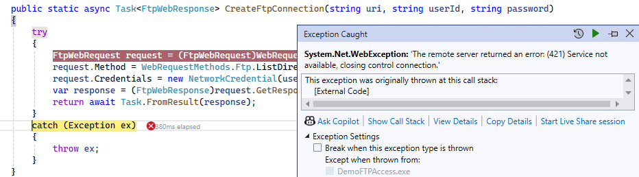 While executing the code, I got (421) Service not available, closing control connection error as shown below.