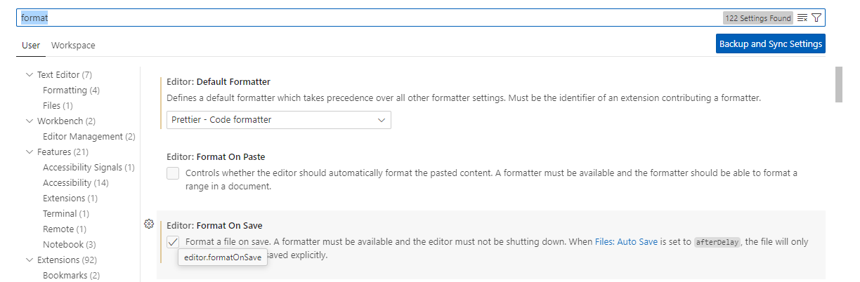 - Search for Format On Save property and select.