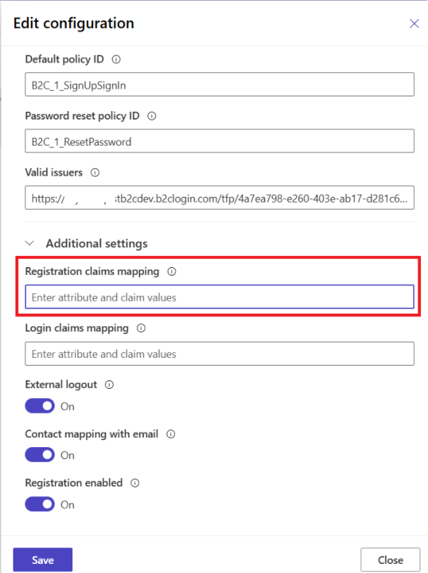 - We need to provide Registration claims mapping value as attribute1=claim1,attribute2=claim2 etc.