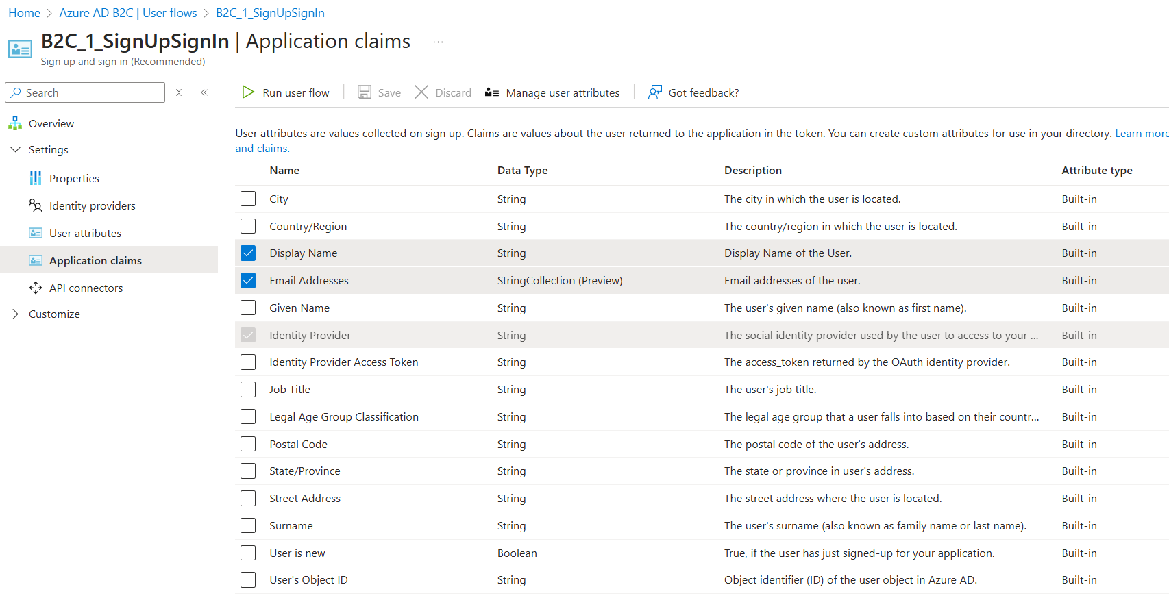 - You will be redirected to Application claims with the list of claims (i.e., Attributes).