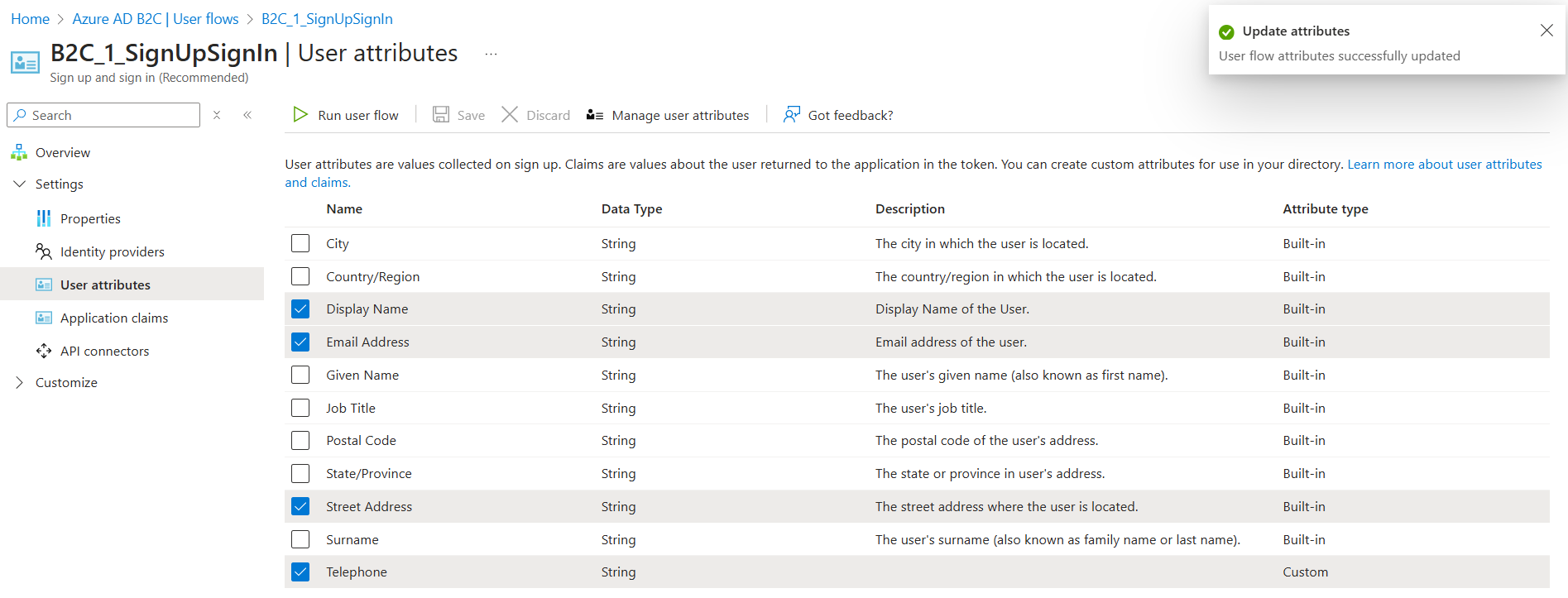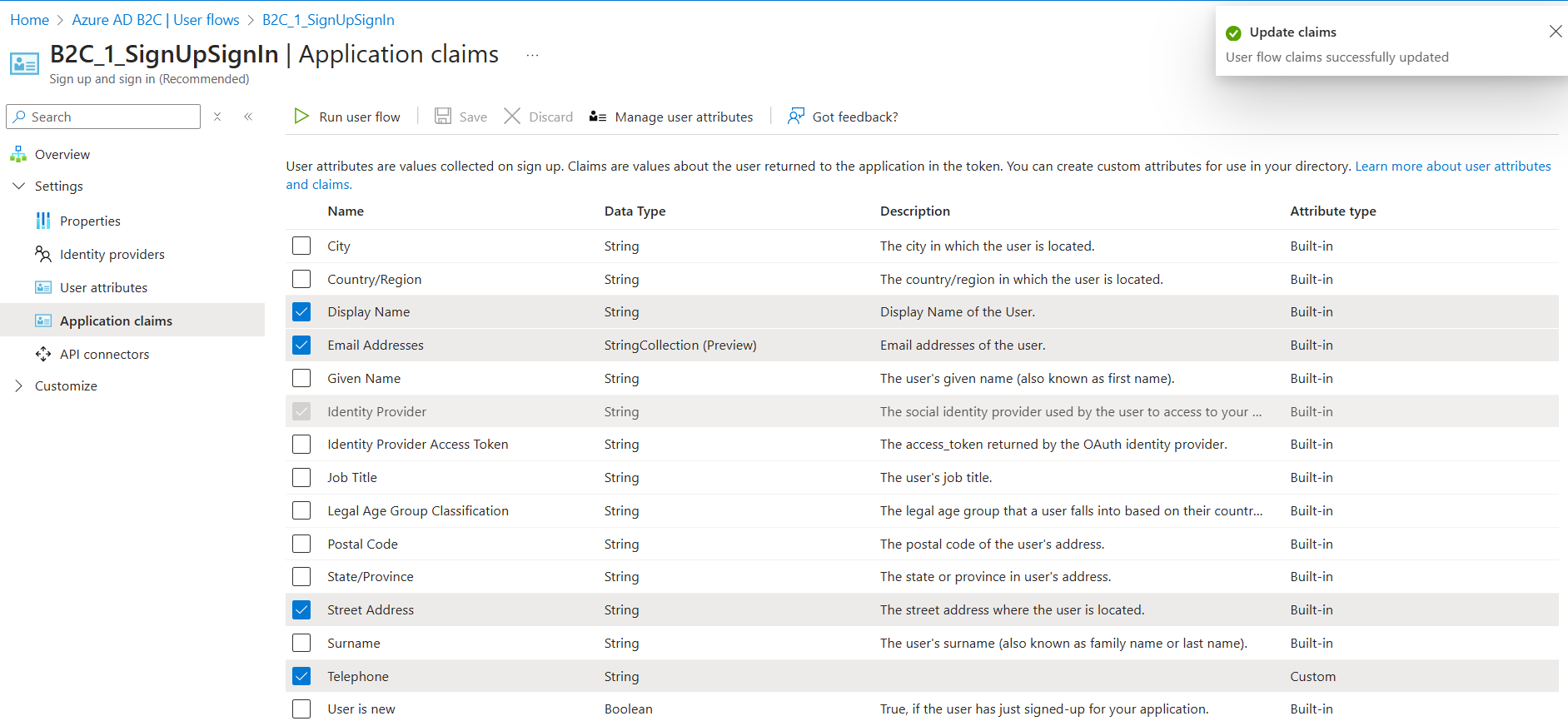 - With both Address and Telephone attributes/claims now available, select them and Save.