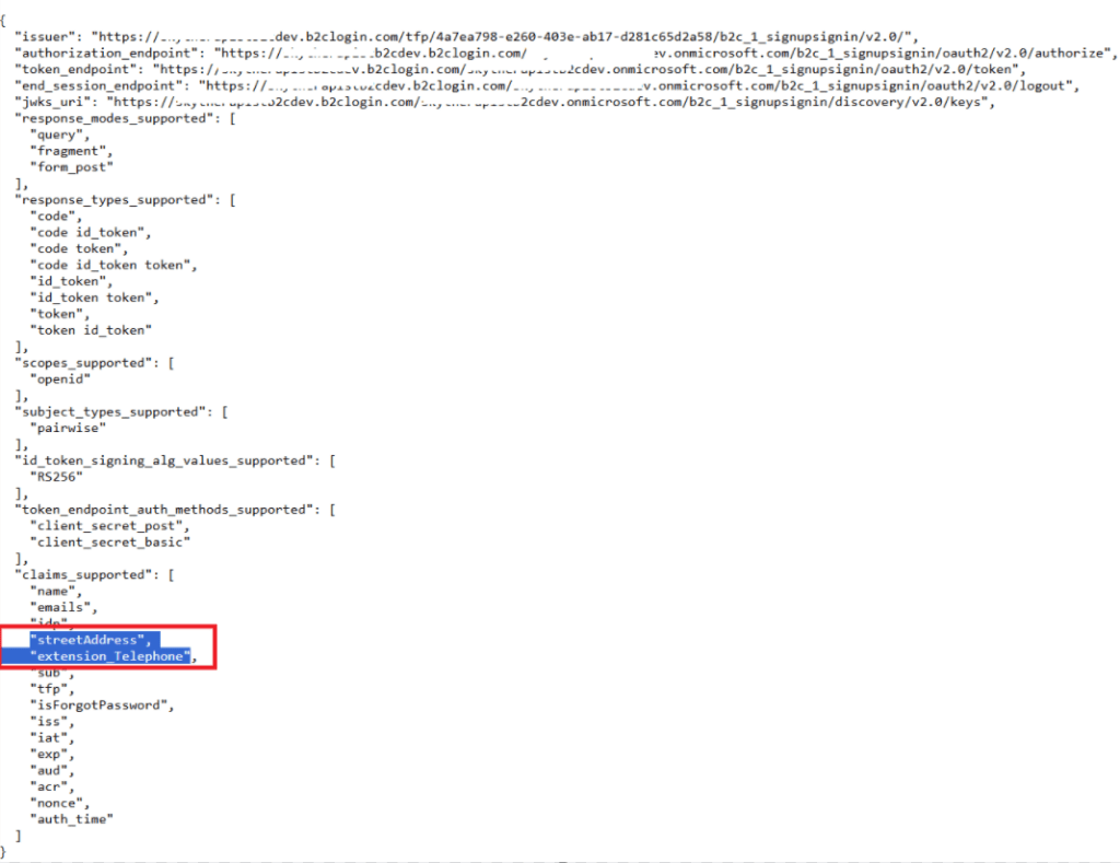 - From the JSON, copy the highlighted attribute schema names (i.e., streetAddress, extension_Telephone). We will be using these copied schema names in Power Pages Azure AD B2C Identity configuration pane.