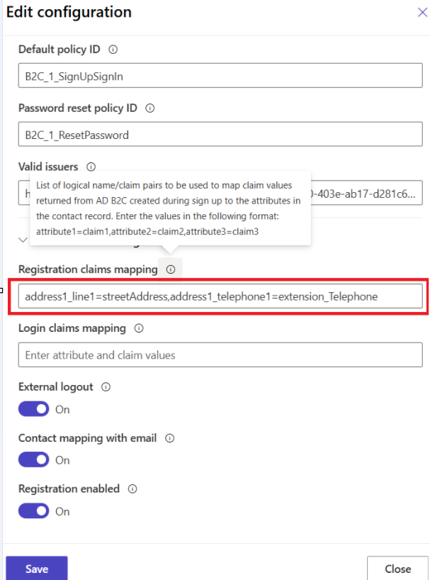 - Now that we have both Contact tables logical attributes and B2C claim schema names, set the Registration claims mapping value as address1_line1=streetAddress,address1_telephone1=extension_Telephone and Save