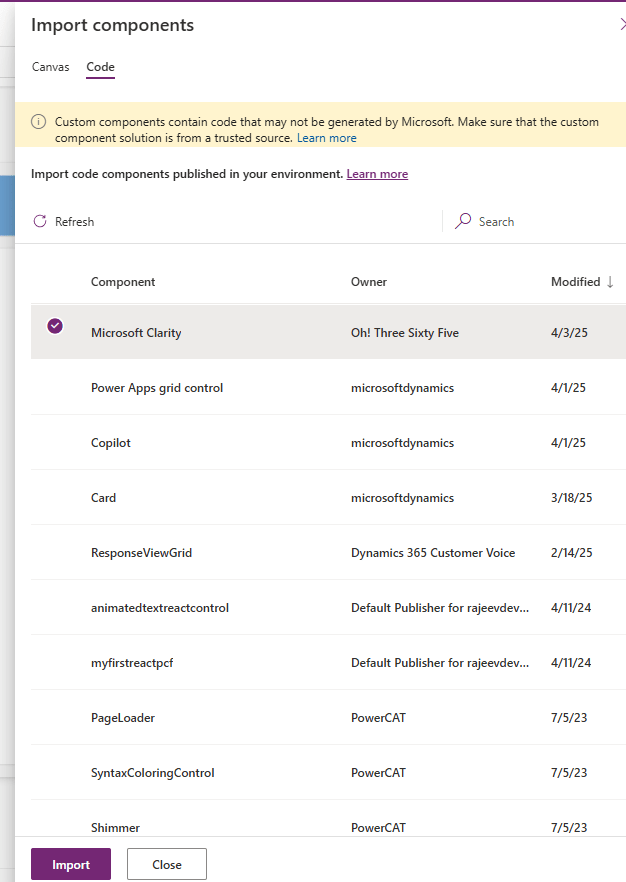 - Select Microsoft Clarity component and click on Import