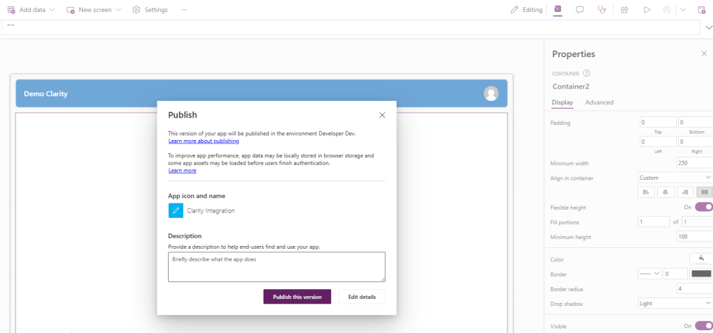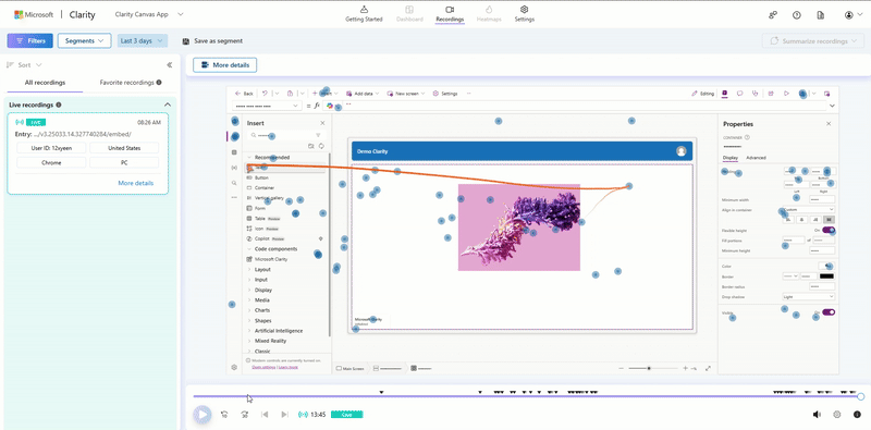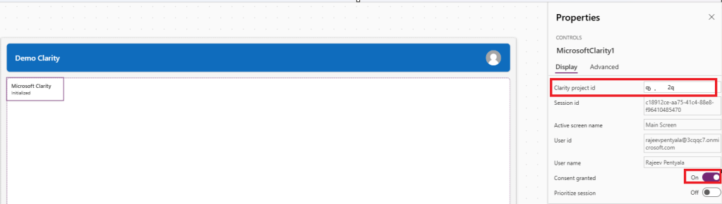 - Next add the Microsoft Clarity component to your Canvas App Screen