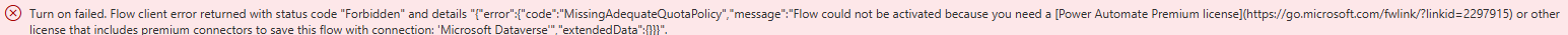 Scheduled flows that use premium connectors will fail to turn on if the flow owner does not have a Power Automate Premium license.