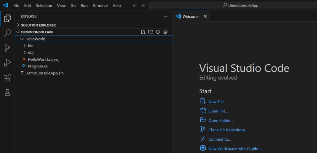 - Here is the important step. Because we installed C# Dev Kit extension, VSCode provides us the SOLUTION EXPLORER view.