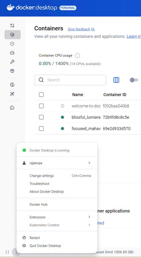- Once the installation is complete, ensure that Docker is running. Confirm it’s in the “Running” state as shown below.
