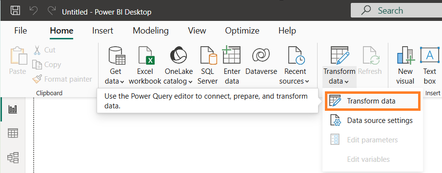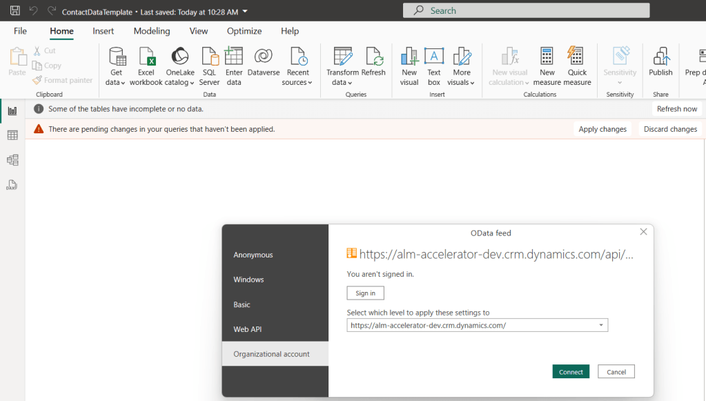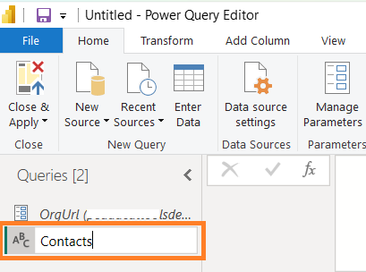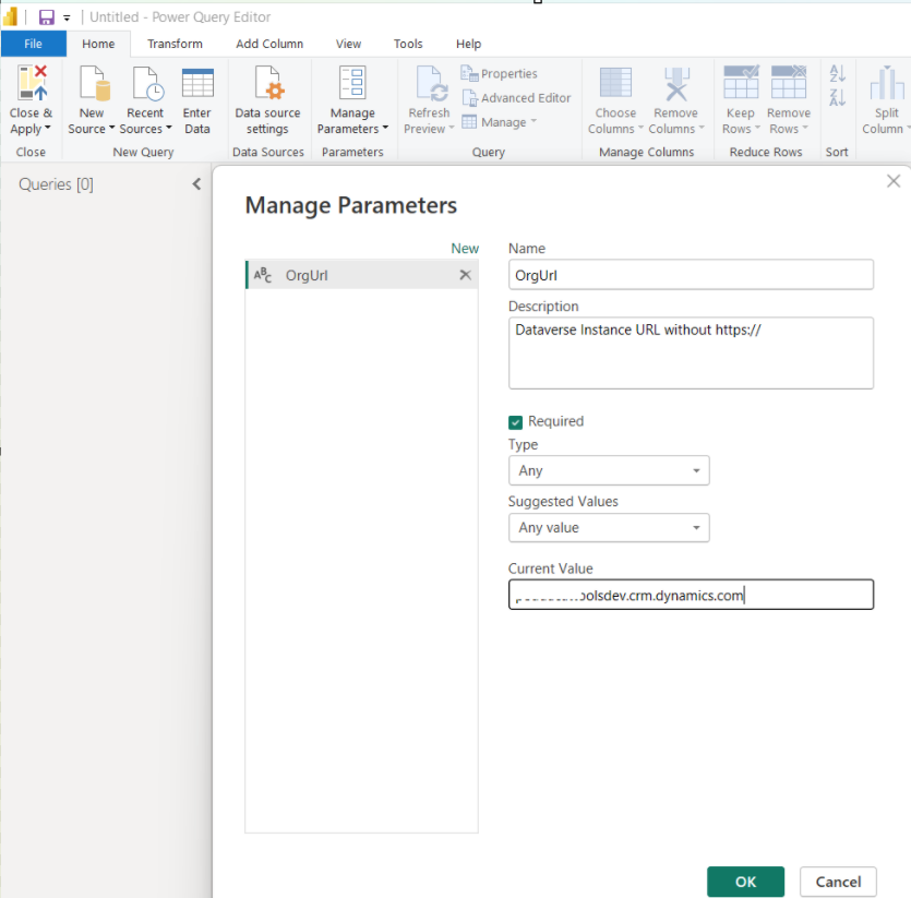 - If you’re not prompted, go to Power Query Editor, and set OrgUrl parameter without the