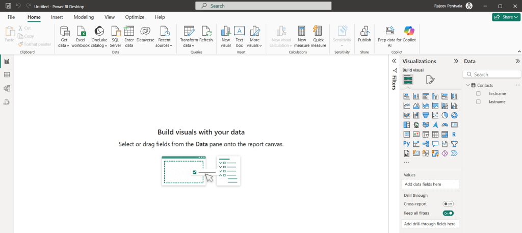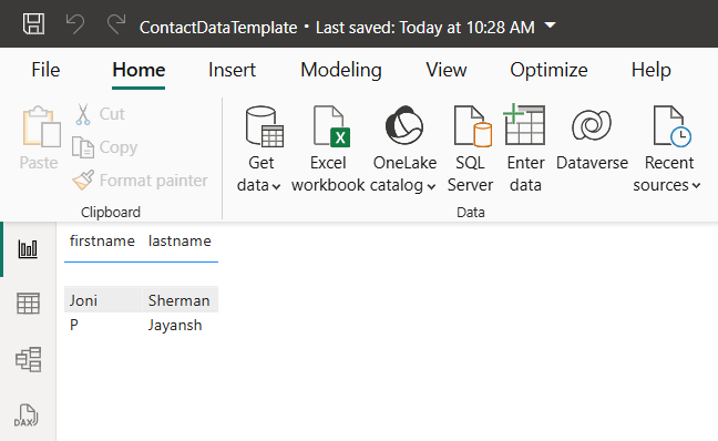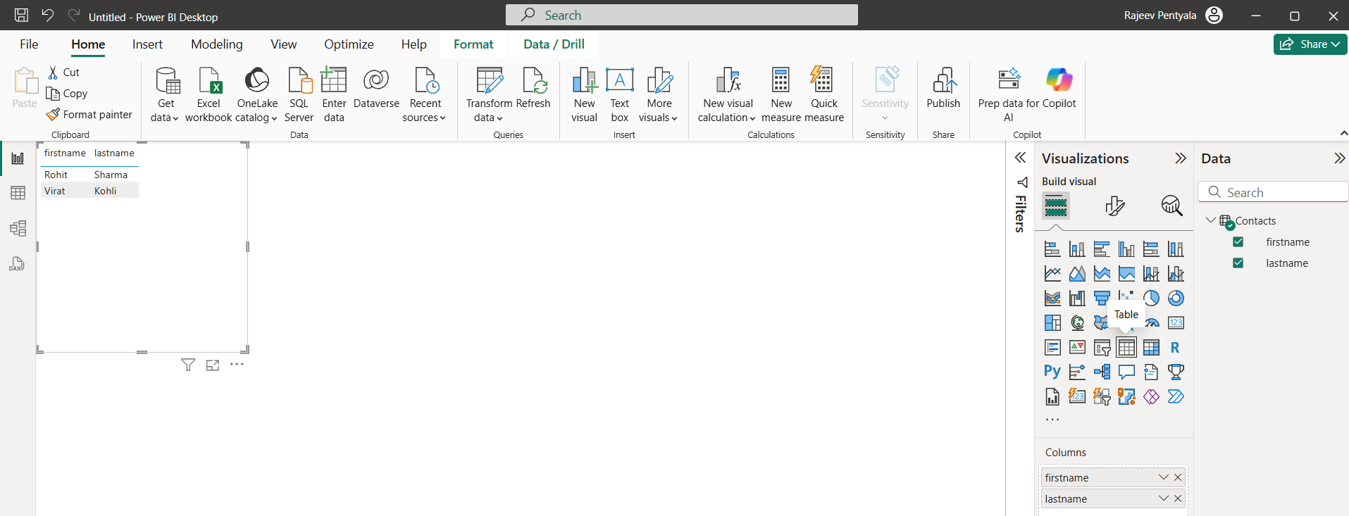 First NameandLast Namefrom theContacttable - Display the data in the prebuilt table visual