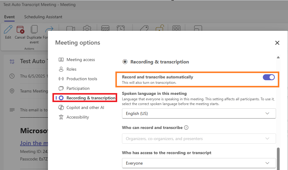 Once we have the Join URL, we can use Microsoft Graph API to identify the meeting and update its settings, such as enabling auto-recording and transcription.