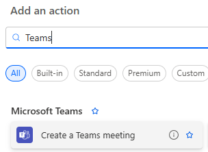 - Add Create a Teams meeting action under the Microsoft Teams connector.