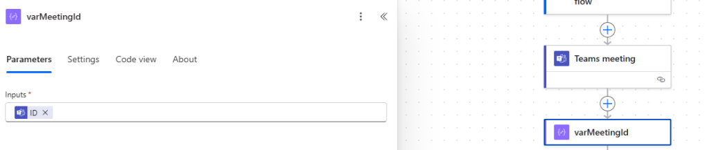 - After creating the Teams meeting, capture the Meeting ID using the following expression and store it in a variable varMeetingId