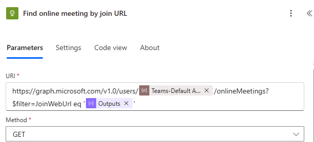 https://graph.microsoft.com/v1.0/users/{GUID of Admin User Id}/onlineMeetings?$filter=JoinWebUrl eq '{outputs('varMeetingURL')}'