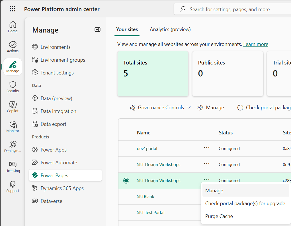 - Select Manage tab, select Power Pages.