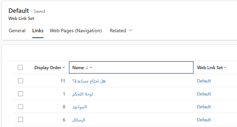 Note: In my example, not all Web Link Set items are fully translated. So you may notice a mix of English and Arabic in the screenshots. The purpose of this article is to demonstrate the setup process, not a fully translated site.
