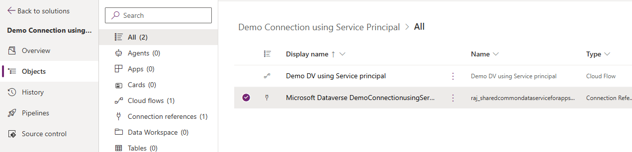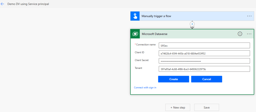 In the example below, I’ve created a flow from a Dataverse solution, that uses a connection named SPDev, authenticated via Service Principal.