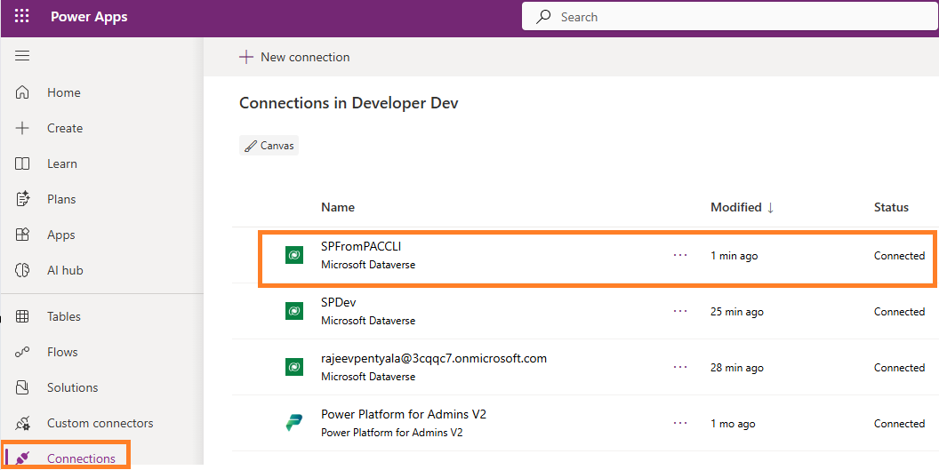- Once you execute the command, the new connection will appear in the Maker Portal under Connections. In my example, a new connection named SPFromPACCLI was successfully created.
