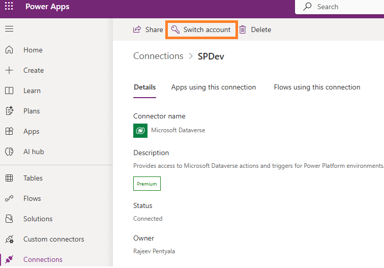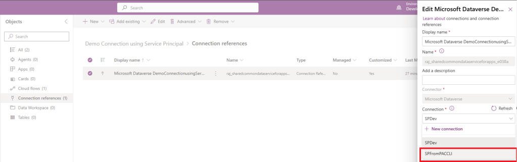 - If needed, you can go to the Connection Reference in your solution and switch it to use the newly created SPFromPACCLI connection.