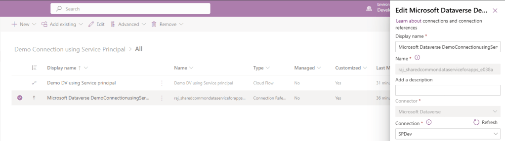 and the Connection Reference linked to the SPDev connection.