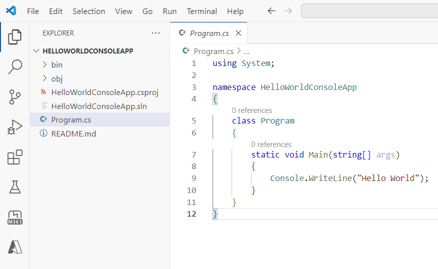 Create a C# core console project. On the Program.cs print 'Hello World'