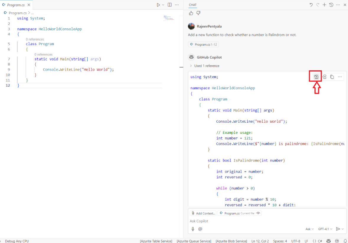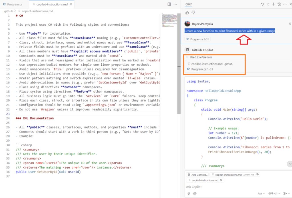 copilot-instructions.mdfile while generating the code. - It generates a function that adheres to all your specified conventions—such as PascalCase method names and