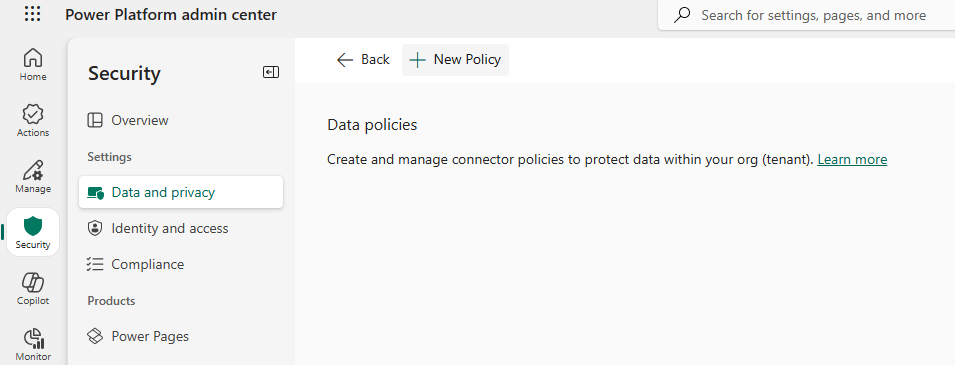 - In the Power Platform admin center, under Security > Data and privacy, select Data policy.